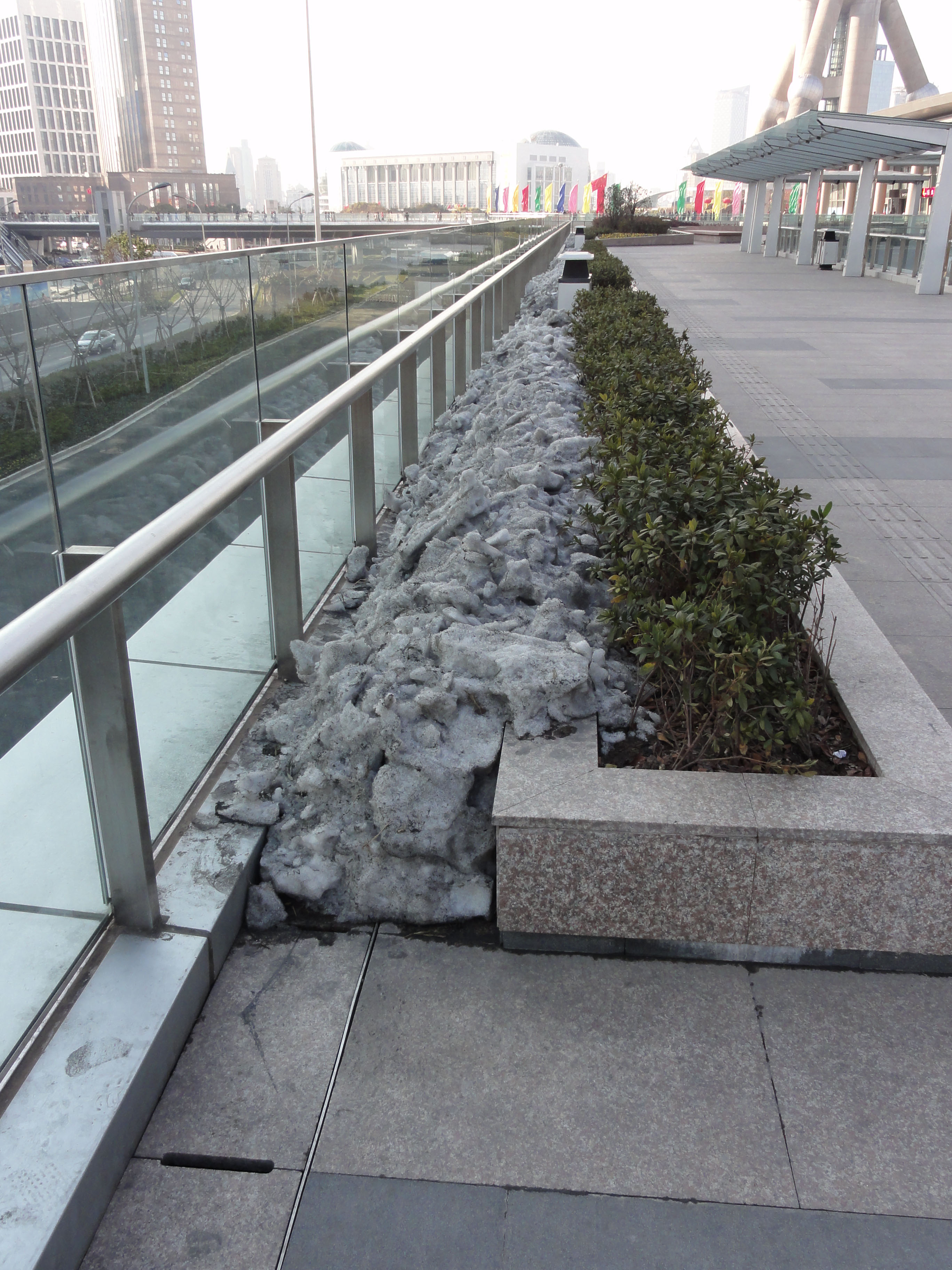 Ende Januar, Schneereste in Shanghai. Rechts im Hintergrund: Oriental Pearl Tower.